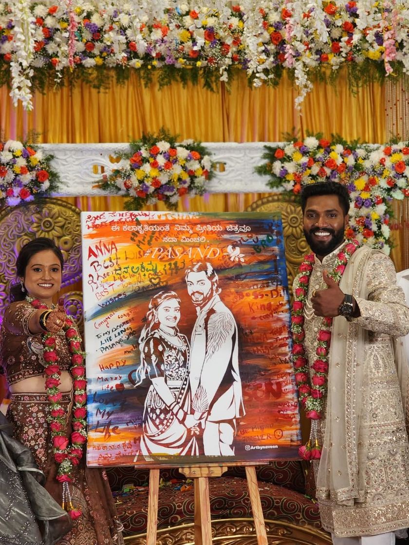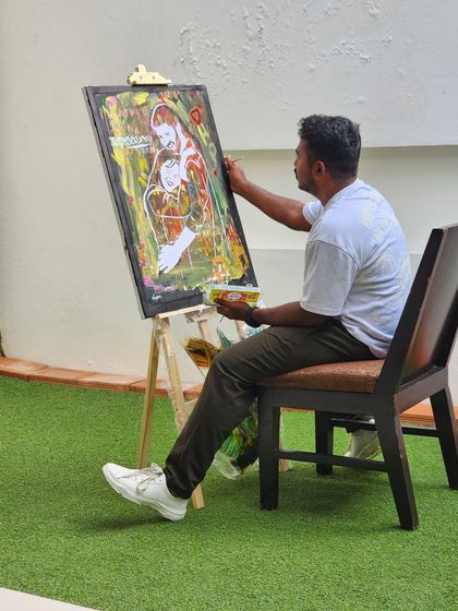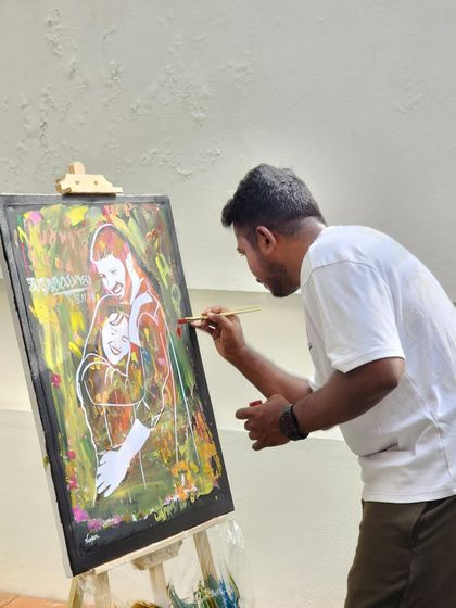 My service is more than just a painting; it's a live performance that adds a unique touch to your event. I work on-site, starting with a vibrant abstract background to reflect the mood, then carefully adding the couple's portrait in my signature white line-art style.