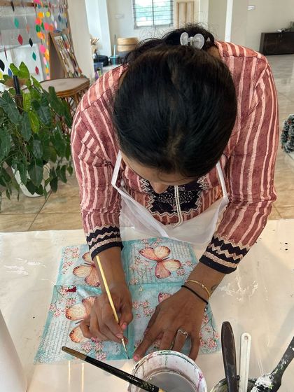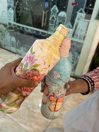 We teach the art of transforming everyday items into beautiful decorative pieces through decoupage - a technique involving cutting, pasting, and creative transformation. Our workshops cover both basic and advanced techniques, with projects like bottle upcycling and tray decoration.