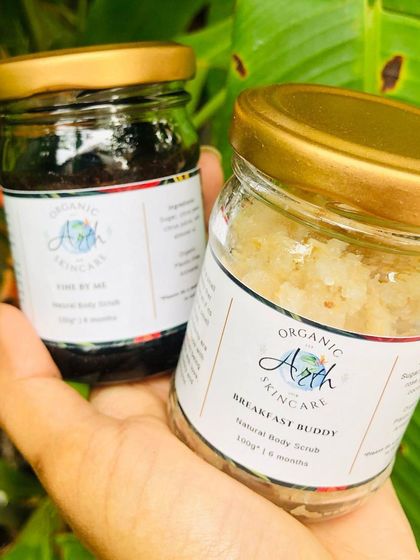 We handcraft organic body scrubs using natural ingredients like sugar, oatmeal, dried rose petals, and coconut oil. Our signature "Breakfast Buddy Sugar Scrub" provides gentle exfoliation while deeply hydrating your skin.