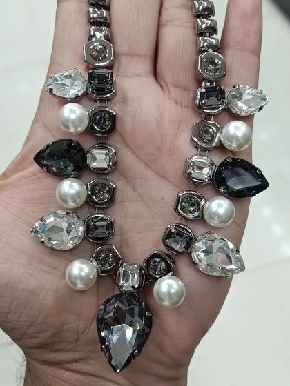 We offer elegant Western Korean necklaces that blend modern and traditional aesthetics. Our designs feature a sophisticated combination of silver, grey, and black elements beautifully accented with pearls.