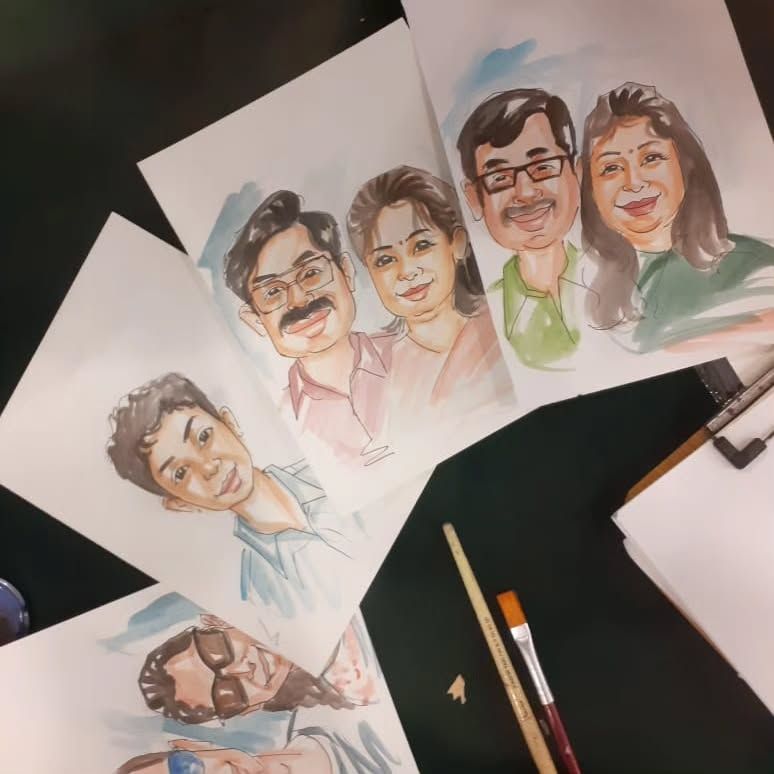 I use bright markers and watercolors to create playful and lively portraits that capture the fun energy of your event. This style is great for solo guests, couples, or families, and makes for a memorable party favor.