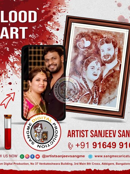 All kinds of art services - Live caricature for weddings, blood portrait painting, oil portraits, pencil sketches, face & body painting, temporary & permanent tattoos, glitter art, sand art, wall art, metro pillar murals, mug painting, and custom gifts.
