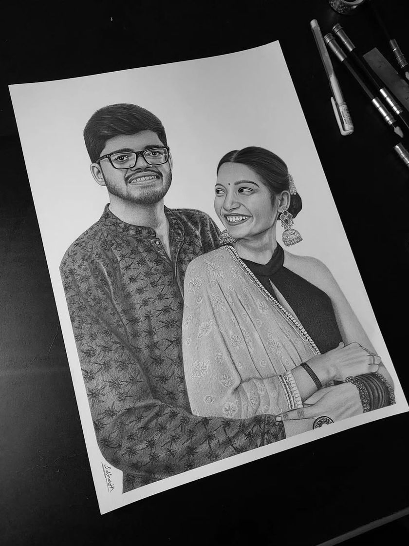 I use Brustro and Kohinoor graphite pencils to create timeless sketches with deep contrast and shading. This style is perfect for solo portraits, couple art, and capturing classic moments that last forever.