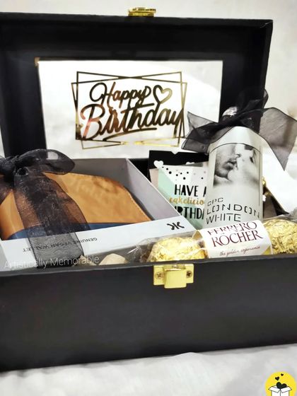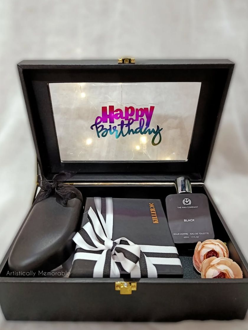 I curate hampers for the special men in your life, whether it's for a birthday, anniversary, or just because. Each box is packed with sophisticated and useful gifts like wallets, perfumes, and sunglasses, often presented in classic black suede or vintage-style trunk boxes.