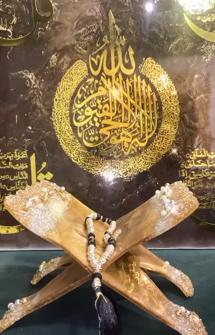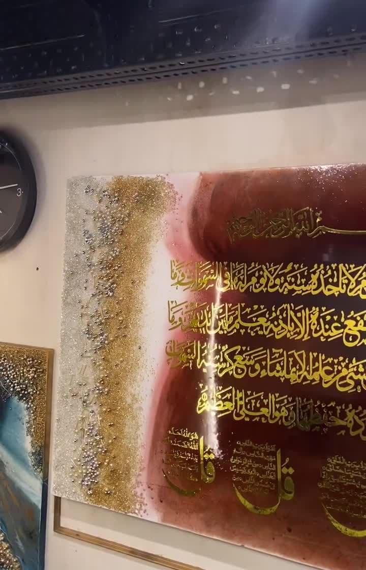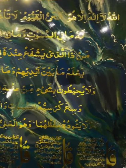 Bring blessings into your home with my large-scale resin wall art, featuring powerful verses like Ayat ul Kursi, the four Quls, and Surah Ar-Rahman. Each piece is handcrafted with a high-gloss finish and can be customized with different colors, textures, and embellishments to become a statement piece.