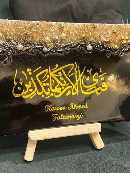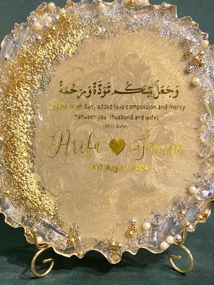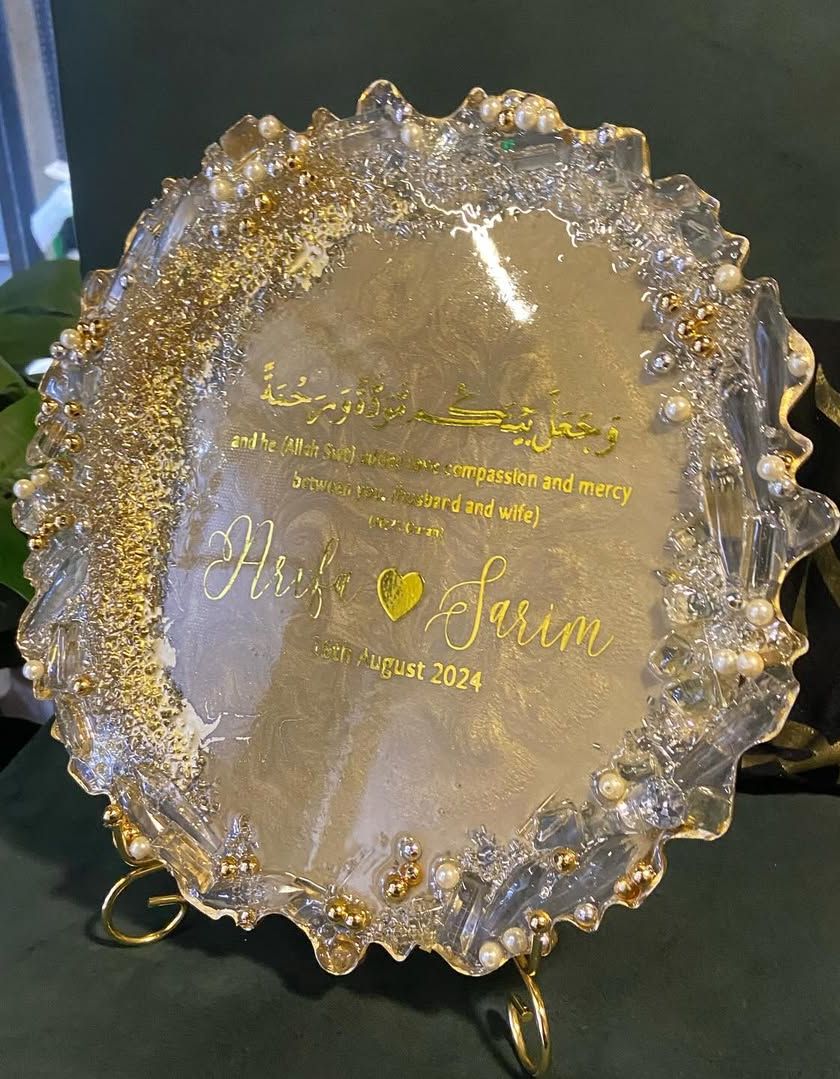 Commemorate the most special unions with a personalized resin plaque or tray. I can inscribe the couple's names, the wedding date, and meaningful Quranic verses like 'And We Created You In Pairs' to create a timeless keepsake of their bond.