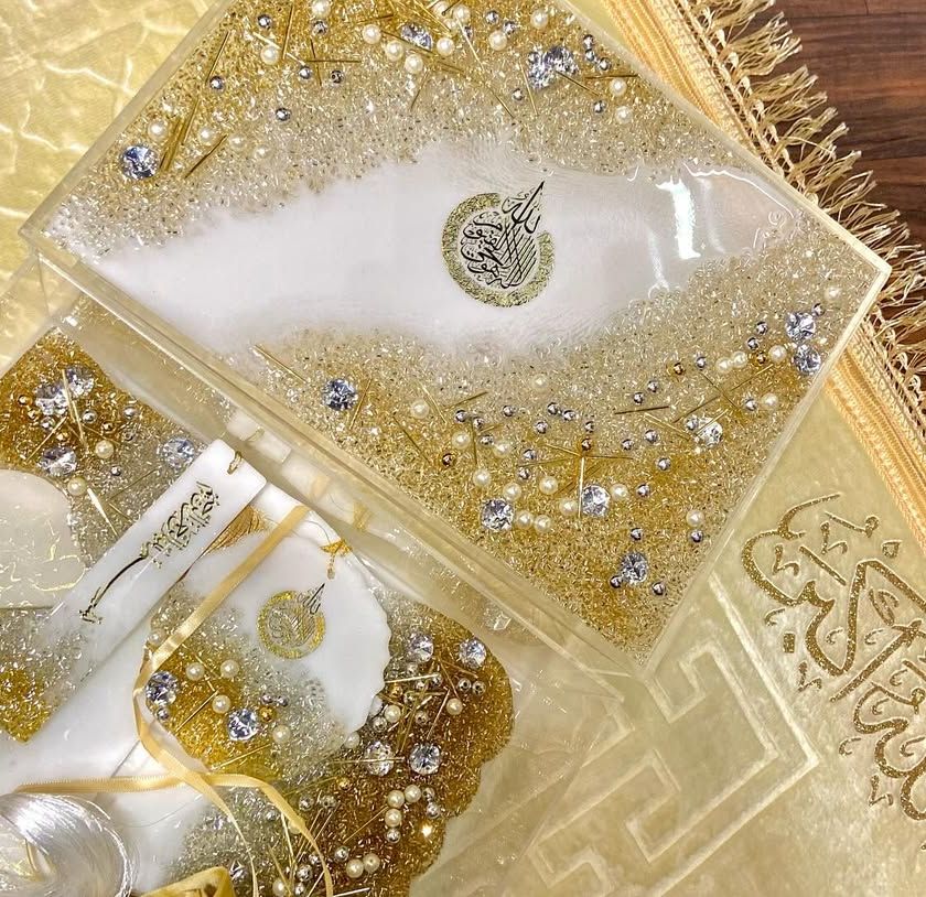 I create these complete gift sets as a spiritual sanctuary in a box, perfect for Ramadan, Eid, or as a wedding present. Each set is fully customizable and can include items like a personalized velvet prayer mat, a resin Quran box and holder, a crystal tasbeeh, and other bespoke accessories.