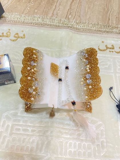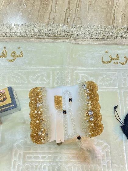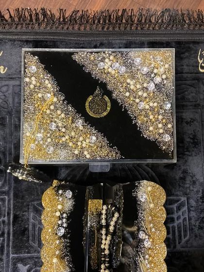I create luxurious Islamic accessories using modern resin techniques. My collection includes intricately designed Quran holders with gold embellishments and pearls, plush prayer mats with dome shapes, and coordinated gift sets featuring tasbeeh (prayer beads) and bookmarks.