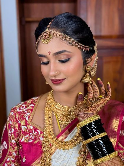 I specialize in luxury bridal makeup with over 9 years of experience, offering both airbrush and traditional makeup techniques. My services include complete bridal styling with saree draping and hairstyling for all wedding ceremonies - from Haldi and Mehendi to Muhurtham and Reception.