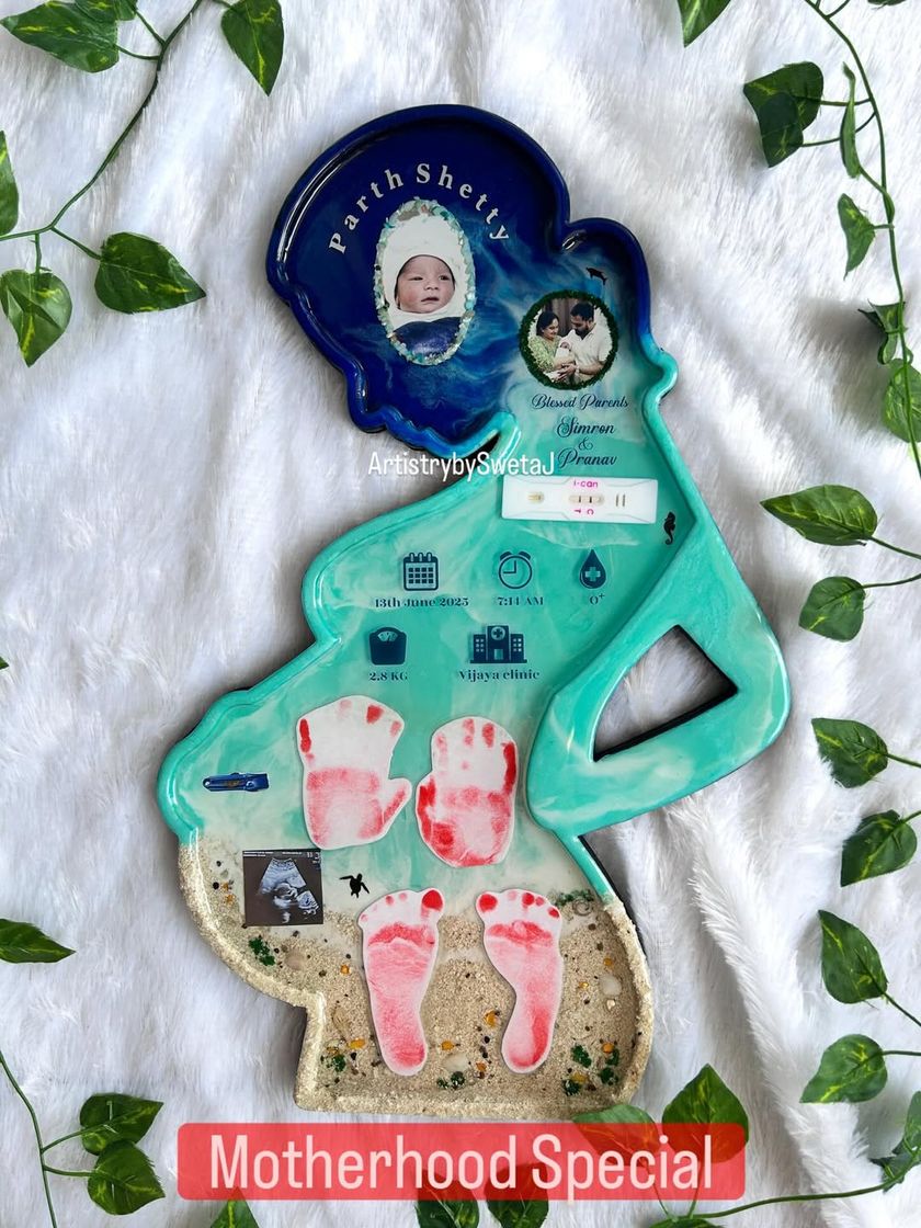 The journey of motherhood is filled with tiny, fleeting moments that you wish you could hold onto forever. I create heartfelt keepsakes that preserve these precious firsts, from the positive pregnancy test and ultrasound scan to your baby's first footprints and birth details, all sealed in a beautiful piece of art.