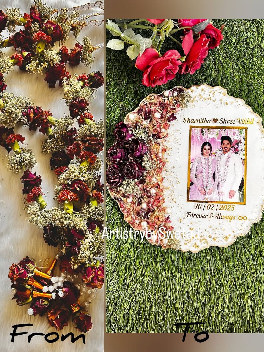 Your love story, from the engagement to the wedding day and all the anniversaries after, deserves to be celebrated. I preserve your most romantic memories, like wedding varmalas and engagement flowers, in custom photo frames, elegant clocks, and personalized plaques that you can cherish for a lifetime.