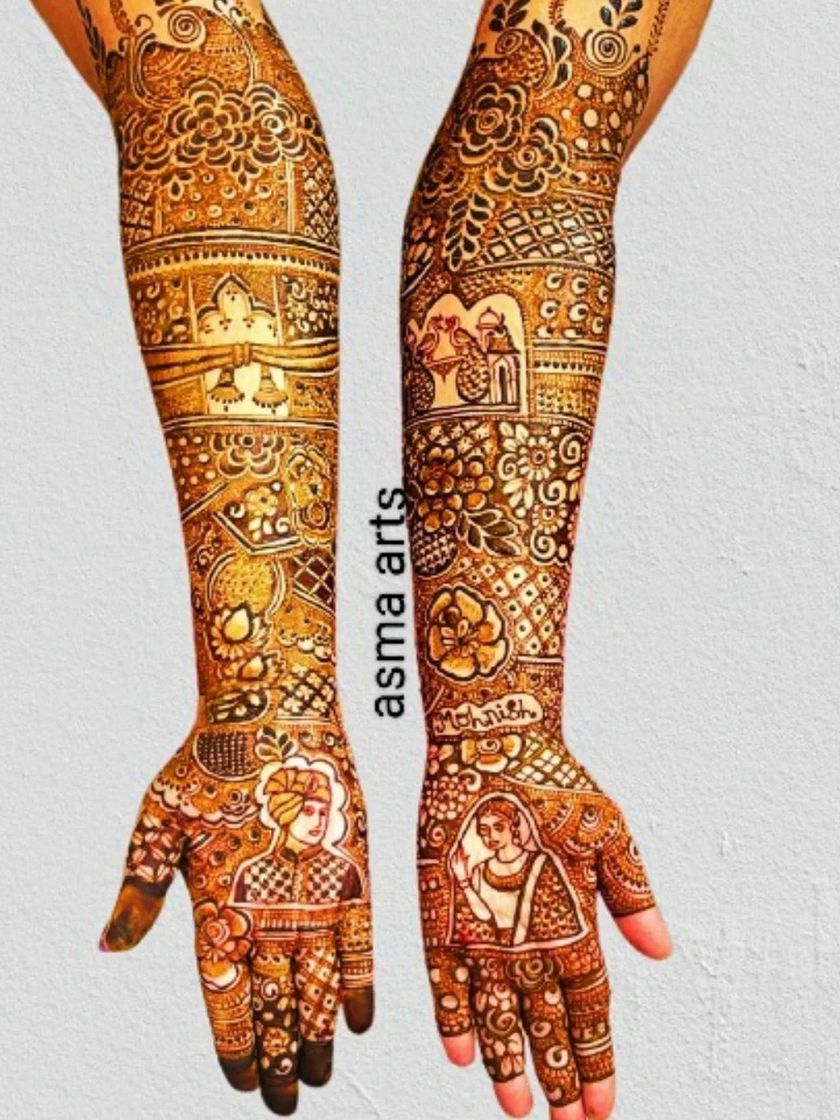 Your wedding mehendi should be as unique as your love story. I specialize in creating detailed narrative designs that include couple portraits, wedding rituals like the varmala or doli, and symbols that are meaningful to you.