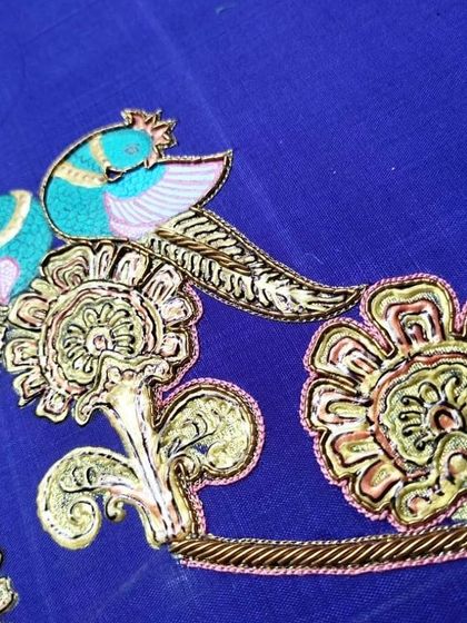 For a truly one-of-a-kind piece, I offer hand-painted Tanjore art directly onto your outfit. This traditional art form, with its vibrant colors and gold leaf details, can transform a simple blouse or gown into a piece of wearable art.