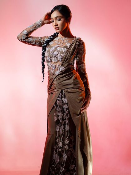 For moments that call for contemporary glamour, I design everything from flowing gowns to chic fusion outfits. This includes concept sarees, power suits, and custom dresses that blend modern silhouettes with unique fabrics and embellishments.