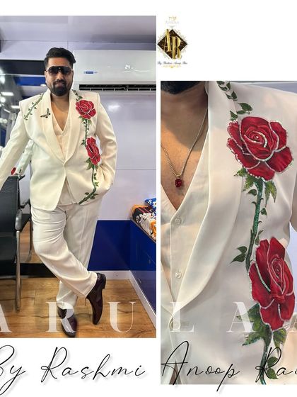 I create custom-tailored suits, blazers, and kurtas that are all about sharp fits and unique details. Whether it's intricate hand embroidery, hand-painted motifs, or unconventional fabrics like linen, each piece is designed to make a statement.