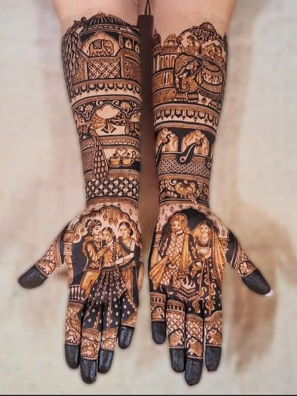 Your wedding day deserves mehndi that is as unique as your love story. We specialize in creating breathtakingly intricate full bridal designs, including detailed portraits, depictions of wedding ceremonies, and personalized motifs that are meaningful to you.