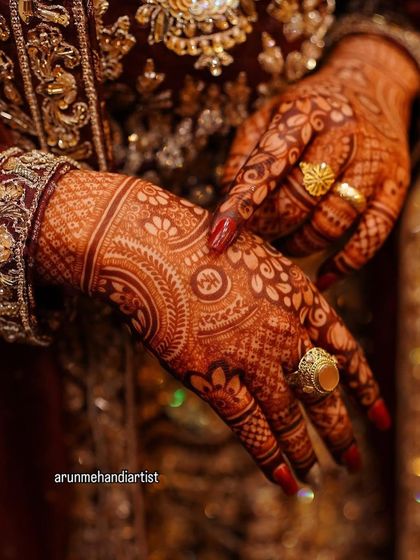 I design personalised bridal and engagement mehndi with custom portraits and traditional motifs, using natural henna for deep colour, and I travel anywhere for full hand and feet coverage.