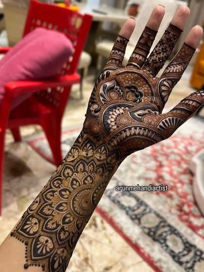 Namaste! I’m Arun, the artist behind Arun Mehndi Art. 22 saal ho gaye, mehndi lagate lagate, aur ab bhi har design dil se banta hai. Jab dulhan ke haath pe dark stain aata hai, wah, dil khush ho jata hai! Hum Mumbai se hain, par kahin bhi bulalo, Goa ho ya Alibaug, hum aa jayenge. Apna chhota studio Kandivali mein hai, aur mehndi sikhate bhi hain. Har design ek kahani hai, aur woh kahani hum banate hain.