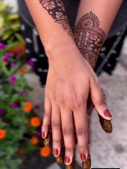 For the most important day, I create elaborate and dense bridal mehndi that extends from your fingertips to your elbows. These designs incorporate everything from traditional motifs and personalized elements to intricate foot or payal designs for a complete bridal look.