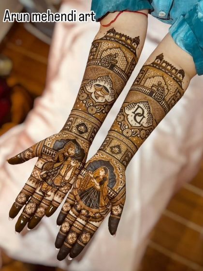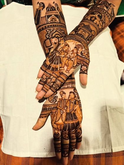 This is a showcase of my best and most requested work. It gives you a quick look at the detailed, story-driven, and personalized mehendi I love to create for my brides. Each design is made with my own 100% natural henna for a beautiful, dark, and safe stain.