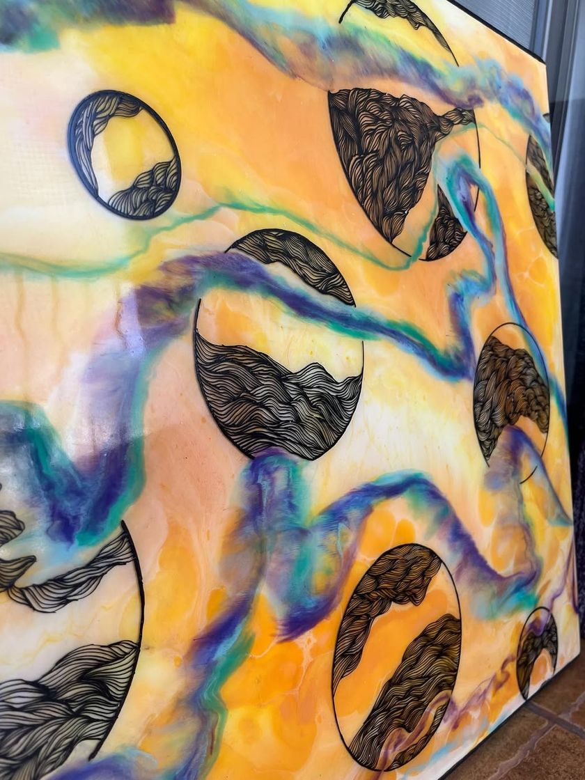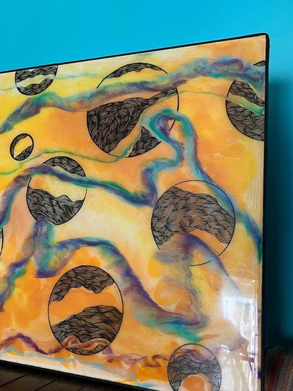 This is where I blend different worlds, mixing my signature doodles or textured elements directly into resin. This process ensures every single piece is completely unique, combining the flow of resin with the precision of hand-drawn art.