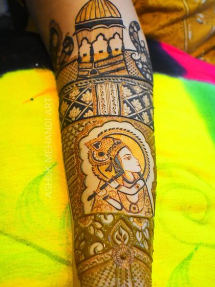 Add a sacred touch to your bridal henna with designs featuring spiritual figures and symbols. I frequently create custom art of Radha Krishna, Lord Ganesh, and Shivlings, alongside classic motifs like peacocks and lotuses.