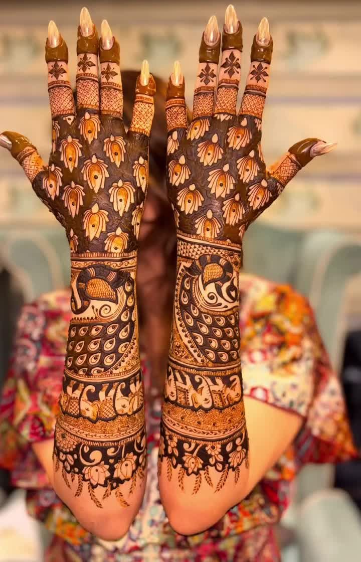 For a grand bridal look, I create intricate designs inspired by royal Indian aesthetics. This includes detailed patterns featuring palaces, architectural motifs, elephants, and traditional wedding scenes like the doli.