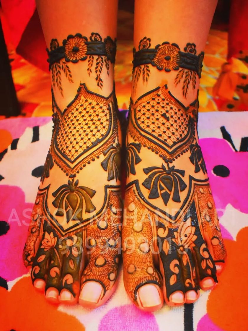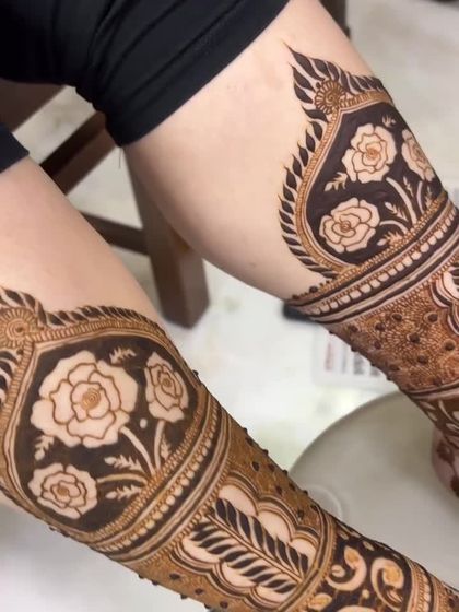 A true bridal look includes beautiful mehndi on the feet and legs. I ensure full coverage with detailed patterns that complement your hand designs, from simple ankle bands to elaborate full-leg artwork.