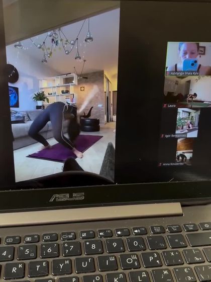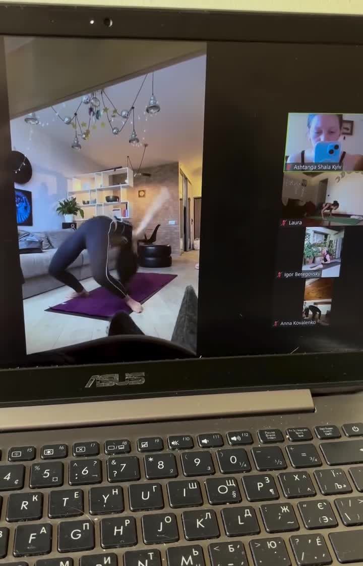 This is what our virtual yoga space looks like. We use Zoom to connect from all over the world, creating a supportive community where you can practice at your own pace with real-time, personalized feedback in both Ukrainian and English.