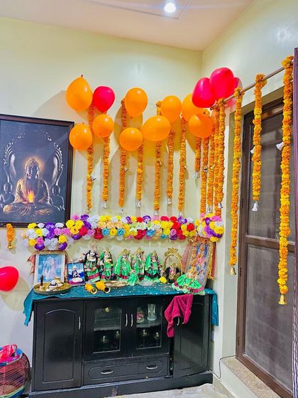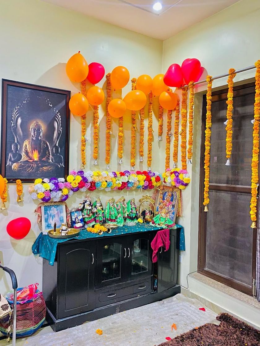 I decorate home mandirs and pooja corners for daily worship or special occasions like Janmashtami. I use a mix of fresh flowers, good quality artificial flowers, pearl strings, and lights to make your sacred space beautiful.