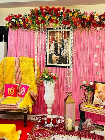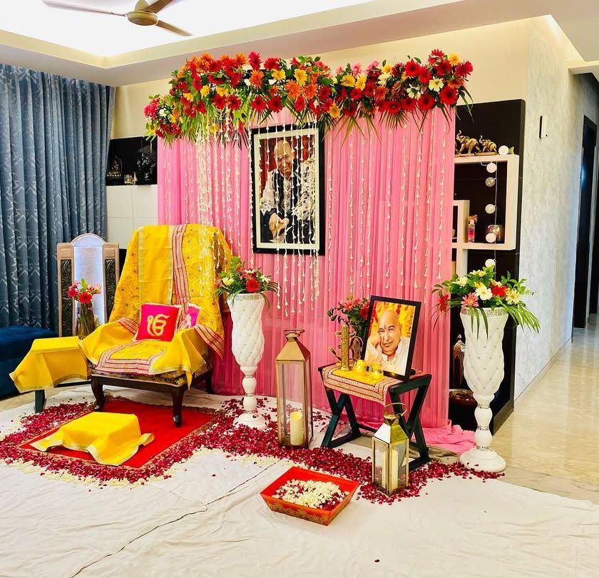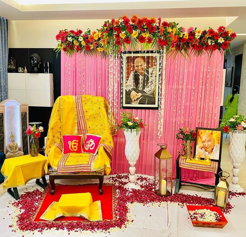 I create a peaceful and respectful space for Guruji satsangs in your home. This includes setting up the main aasan with a yellow shawl, a backdrop with curtains and flowers, and arranging lanterns and petals for a serene atmosphere.