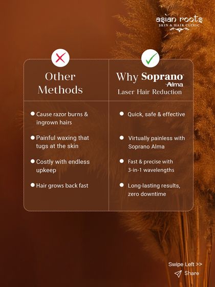 We use US FDA-approved Soprano laser for quick, pain-free hair reduction on all skin types, including sensitive skin, with no downtime and full body coverage.