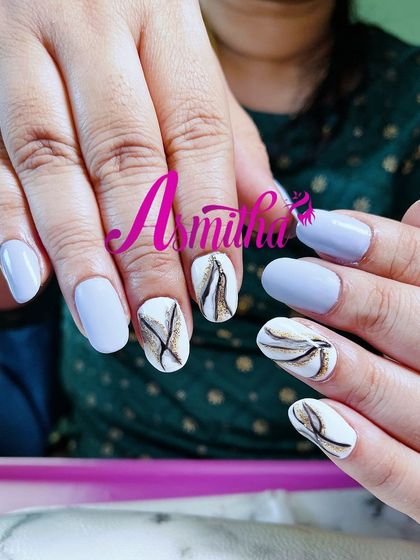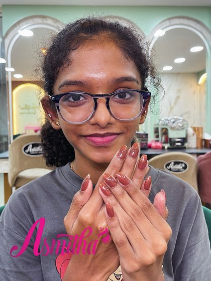 We provide professional nail services including extensions, gel polish art, chrome finishes, glitter marble designs, and ombre styles. Our bridal nail services feature intricate designs with stones and studs.