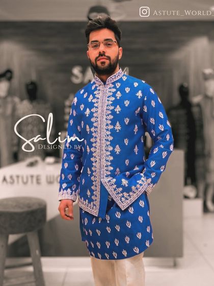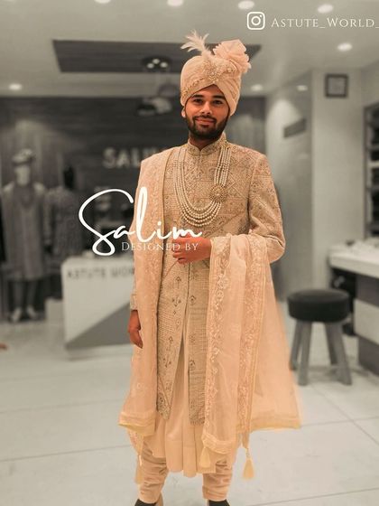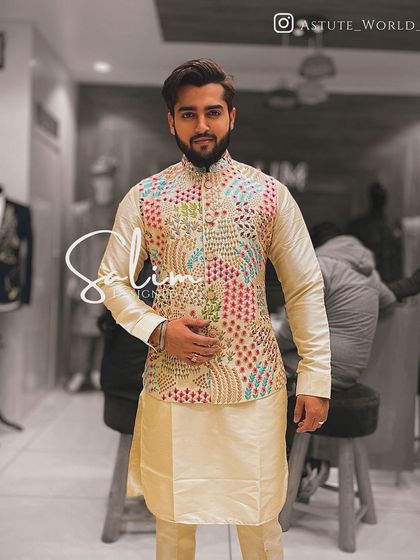 I make custom men's wedding and ethnic outfits in Delhi, with hand embroidery and fittings so your look is unique and fits you perfectly.