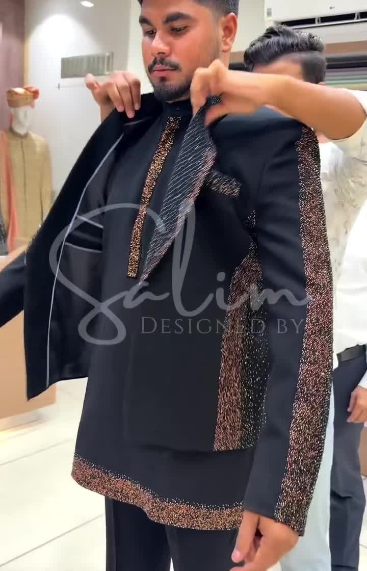 Explore my collection of classic Jodhpuri and Bandhgala jackets, perfect for a regal and sophisticated look. I use premium fabrics like velvet, brocade, and pashmina, with options for subtle woven designs or bold, hand-embroidered motifs.