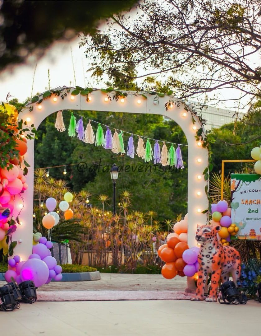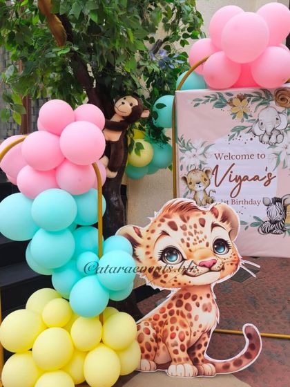 I offer two distinct jungle adventures: a soft, pastel safari perfect for first birthdays with cute animal cutouts, and a vibrant, wild jungle with life-size props. Both include themed seating, play areas, and immersive decor.