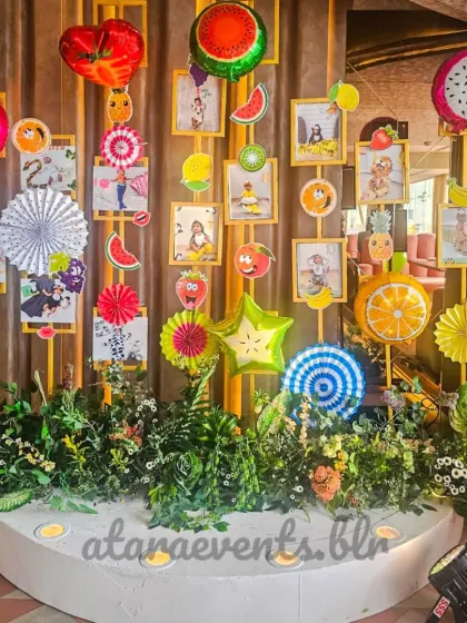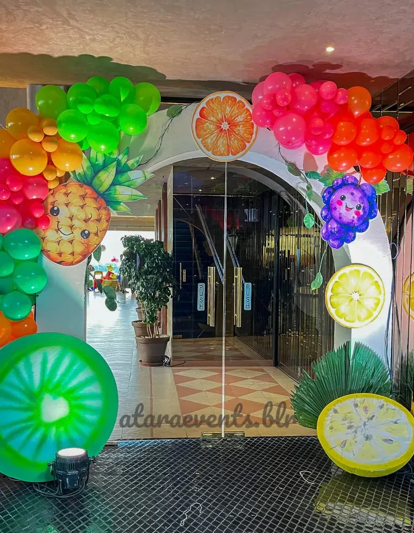 I create vibrant, juicy celebrations with our "Tutti Frutti" theme, perfect for first birthdays. This setup includes custom fruit-themed backdrops, colorful balloon arrangements, and fun food stations like chocolate fountains and donut walls.
