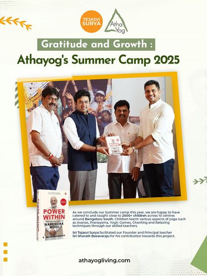 We are passionate about sharing the benefits of yoga with young minds. In collaboration with the office of Tejasvi Surya, we conduct summer camps for children that focus on holistic growth through yoga, self-defense, art, and other engaging activities.