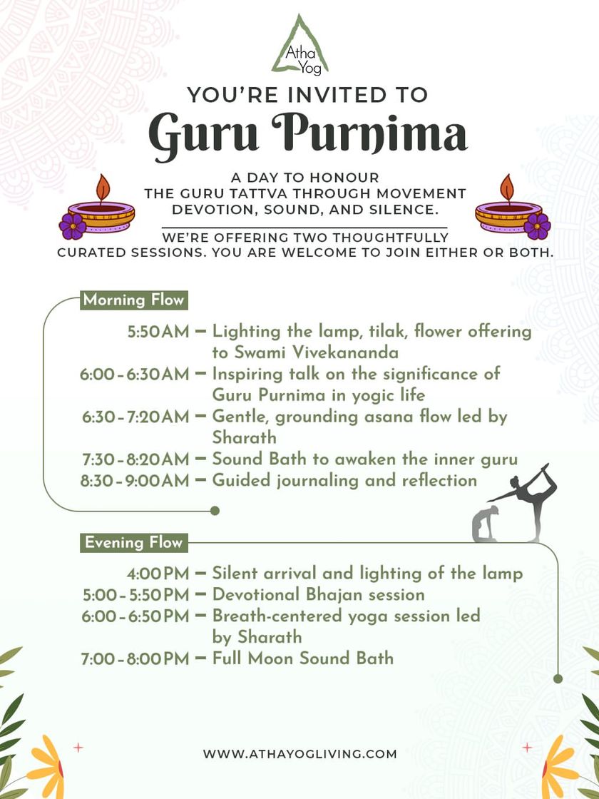 For those seeking a deeper spiritual connection, we host special events like our Guru Purnima celebration and spiritual retreats. These gatherings feature practices like bhajans, sound baths, guided meditation, and discourses on yogic philosophy.