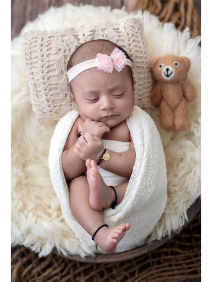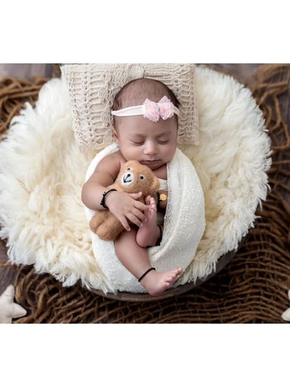 These are the timeless, peaceful images that focus purely on your newborn. I use soft wraps, cozy baskets, and gentle posing techniques in my temperature-controlled Borivali studio to capture your baby sleeping soundly and safely. This cluster includes a variety of setups from simple swaddles to sessions with props like teddy bears.