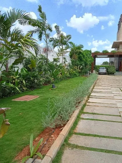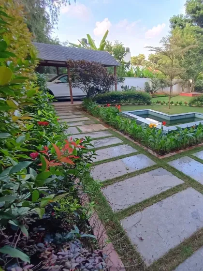 We design and install gardens with real lawns, stone paths, planting beds, vertical walls, and water features for homes and businesses, focusing on full transformation and lasting results.