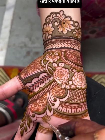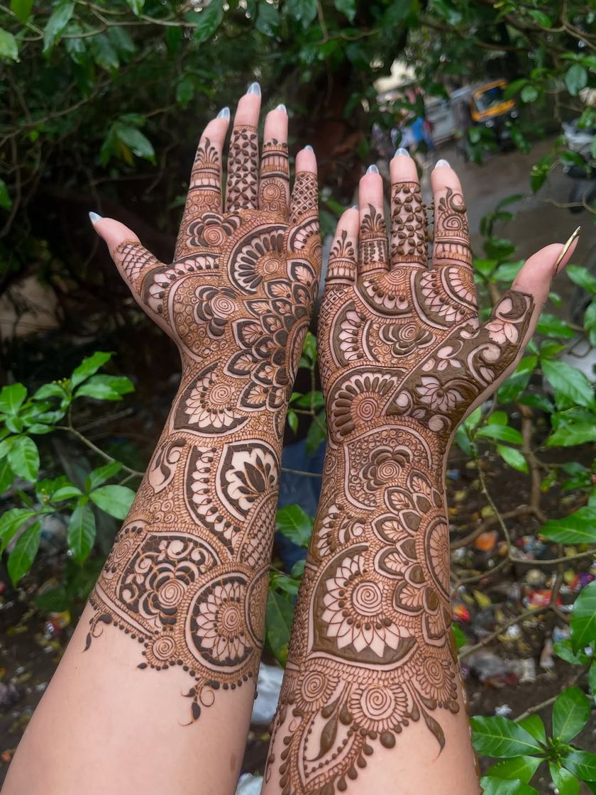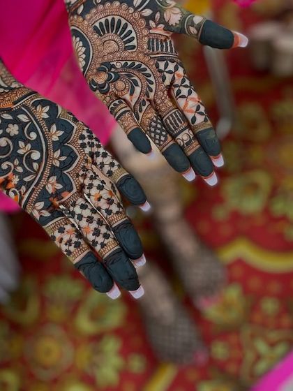 For my brides, I create dense, elaborate designs that cover the hands and extend up to the elbows. I use fine lines, detailed patterns, and 3D shading to make traditional motifs like flowers, paisleys, and mandalas stand out beautifully.