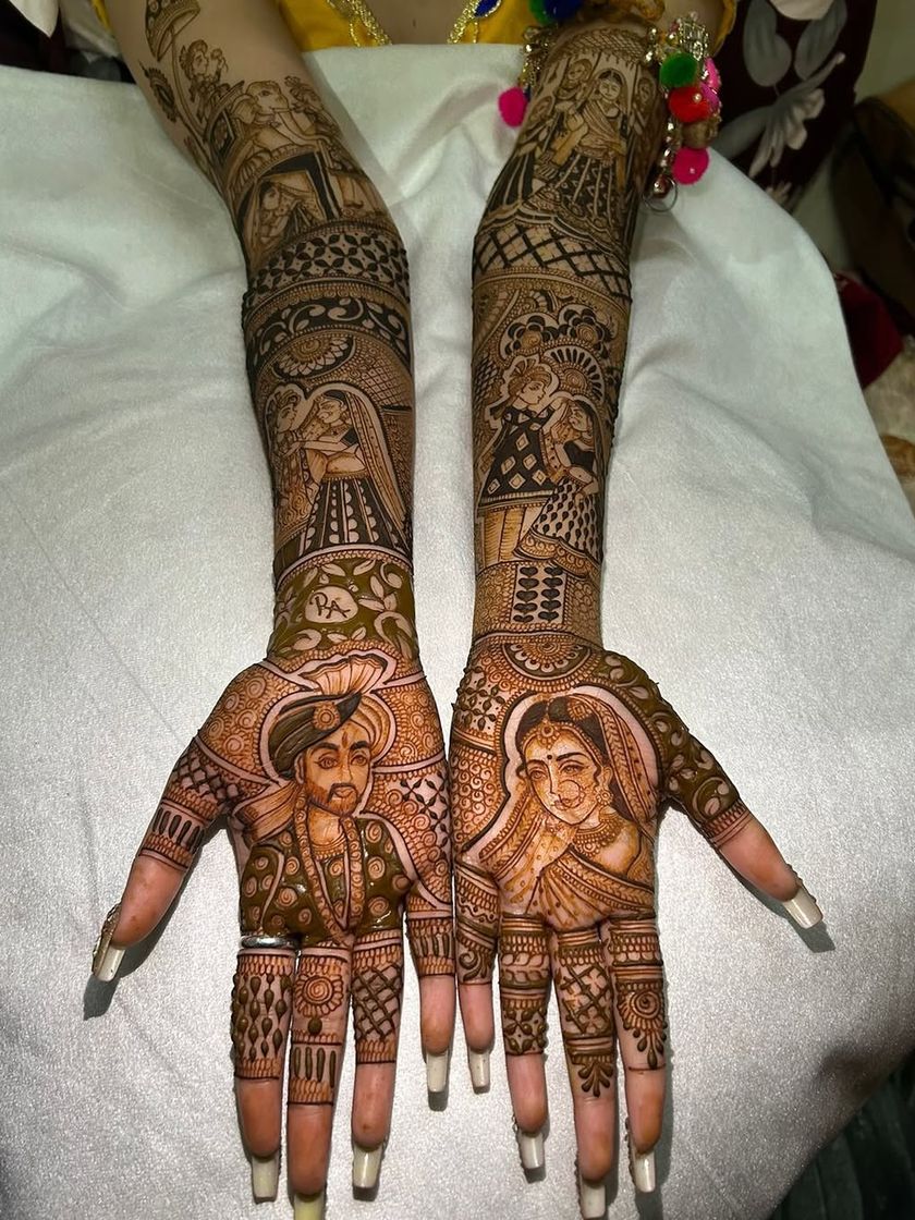 Your mehandi should tell your story. I love creating custom designs that include portraits of the couple, wedding dates, special initials, or even your favorite hobbies and places. Just tell me your idea, and we will weave it into your bridal henna.