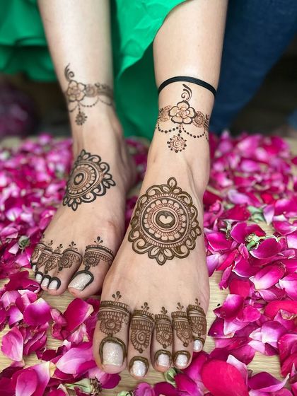 I specialize in creating elaborate bridal henna designs covering hands, arms, and feet. My designs feature traditional motifs like paisleys, peacocks, lotus patterns, and geometric shapes, with options to incorporate personalized elements like initials or meaningful symbols.