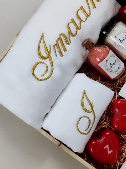 My most popular creations are for celebrating couples. I design each hamper with personalized touches like embroidered names on towels and robes, and even custom initial soaps. You can choose from various themes like classic gold and white, modern black and gold, or vibrant red, all packed with my homemade organic spa goodies.