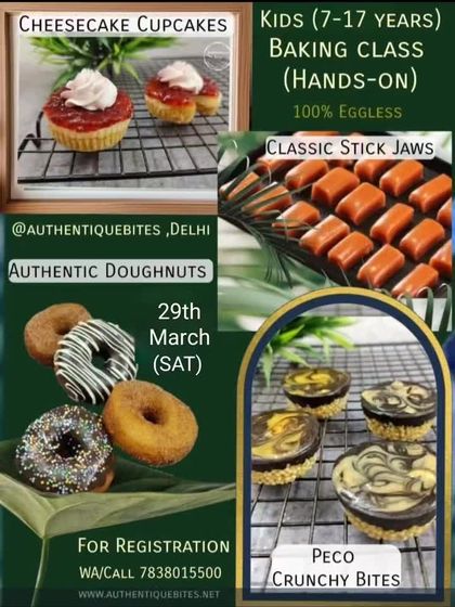 Our classes cover a diverse menu of 100% eggless desserts that are perfect for young, aspiring bakers. We teach everything from creamy cheesecakes and classic doughnuts to our signature crunchy peco bites and fun seasonal specials, ensuring every child leaves with new skills and a box full of treats.