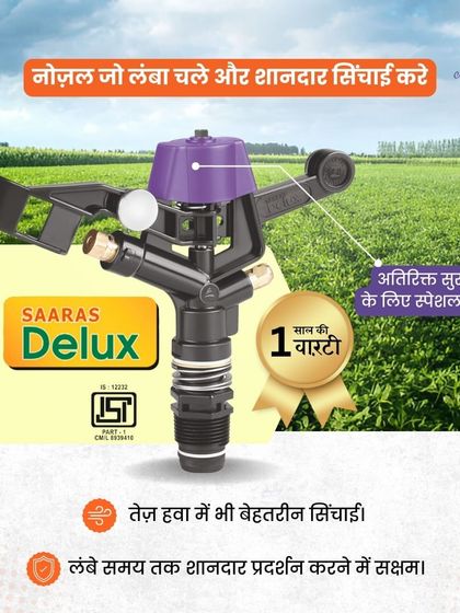 Proudly Made in India - Saaras Delux sprinkler gives precise irrigation, 1-year warranty, trusted by lakhs of farmers, made for every season.