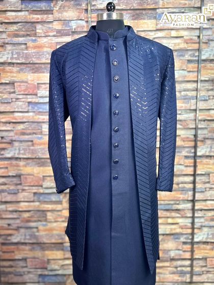 - Modern Sherwanis: My Lakhnavi Sherwani set in navy blue is a favorite. The jacket has a chevron pattern with just enough shimmer from sequins, so it’s flashy but not over the top.