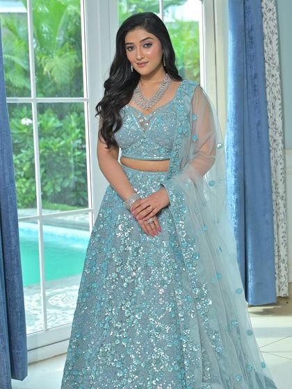 - Glam sangeet and reception lehengas, full of sequins, in cool colours like powder blue and ivory. Super comfy for dancing non-stop.