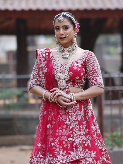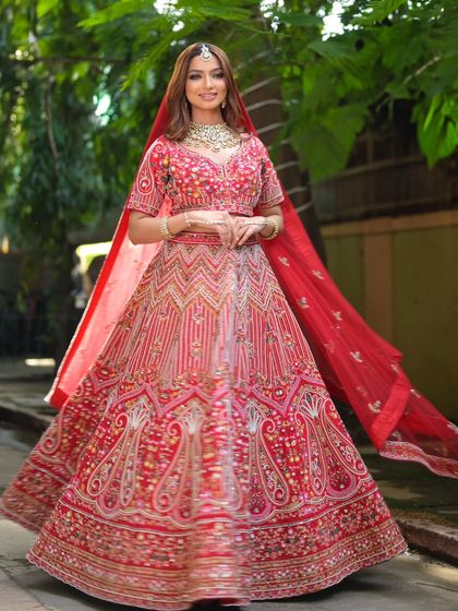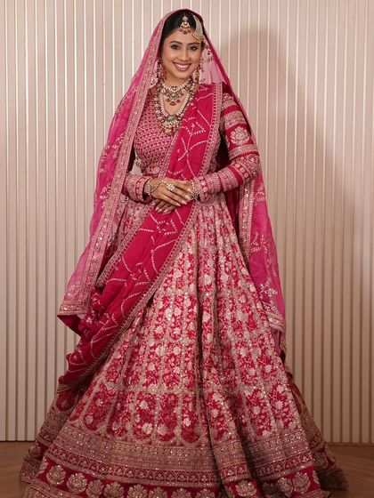 - Bridal lehengas loaded with heavy embroidery, classic reds, and rani pinks for that shaadi (wedding) vibe.